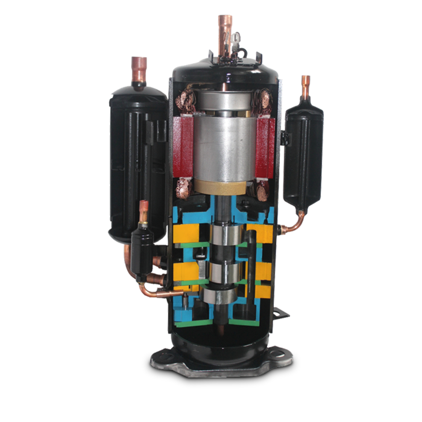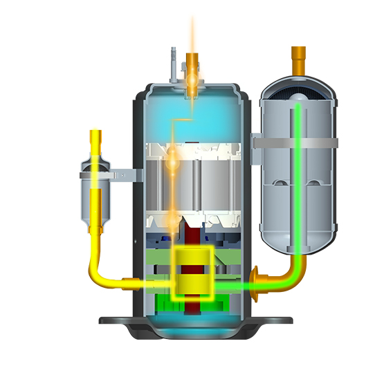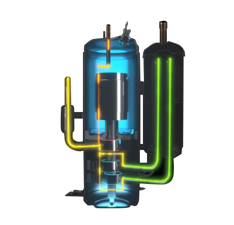 三缸雙級變容積比壓縮機可實現兩種不同容積比的雙級壓縮,可降低單個氣缸的壓縮比,減小了泄漏量,提高了壓縮機的容積效率,與單級壓縮系統相比,雙級增焓壓縮系統具有能力高、能效高和可靠性高的優勢,使用在家用熱泵空調、多聯式熱泵空調、戶用冷水熱泵機組等多種類型的熱泵產品中。