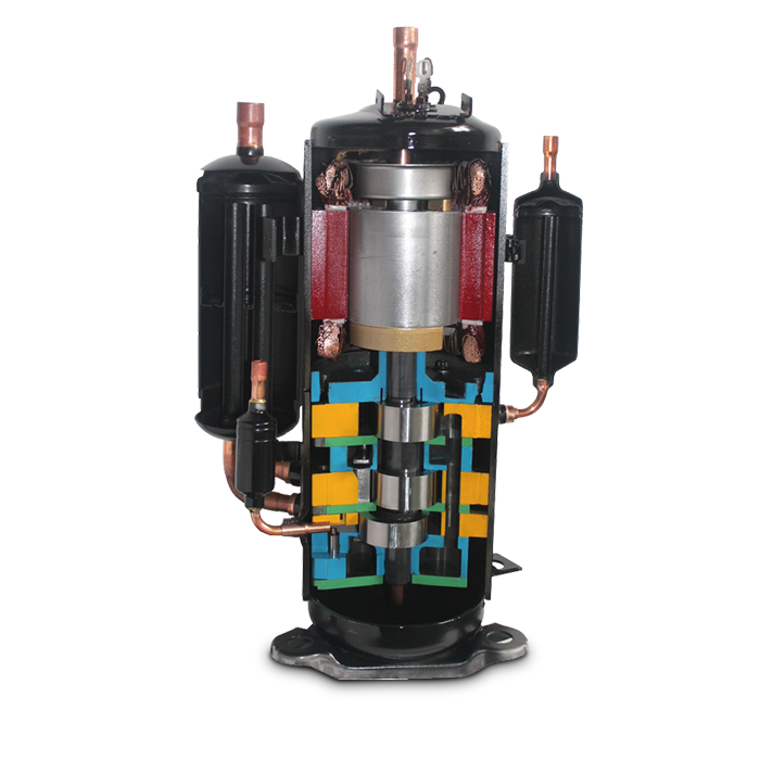 三缸雙級變容積比壓縮機可實現兩 種不同容積比的雙級壓縮,可降低單個氣缸的壓縮比,減小了 泄漏量,提高了壓縮機的容積效率,與單級壓縮系統相比,雙 級增焓壓縮系統具有能力高、能效高和可靠性高的優勢,使用 在家用熱泵空調、多聯式熱泵空調、戶用冷水熱泵機組等多種 類型的熱泵產品中。