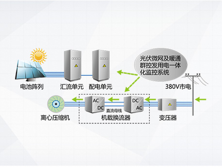 光伏發(fā)電系統(tǒng)不發(fā)電,主機(jī)向電網(wǎng)取電運(yùn)行,機(jī)組相當(dāng)于常規(guī)高效變頻離心機(jī)。