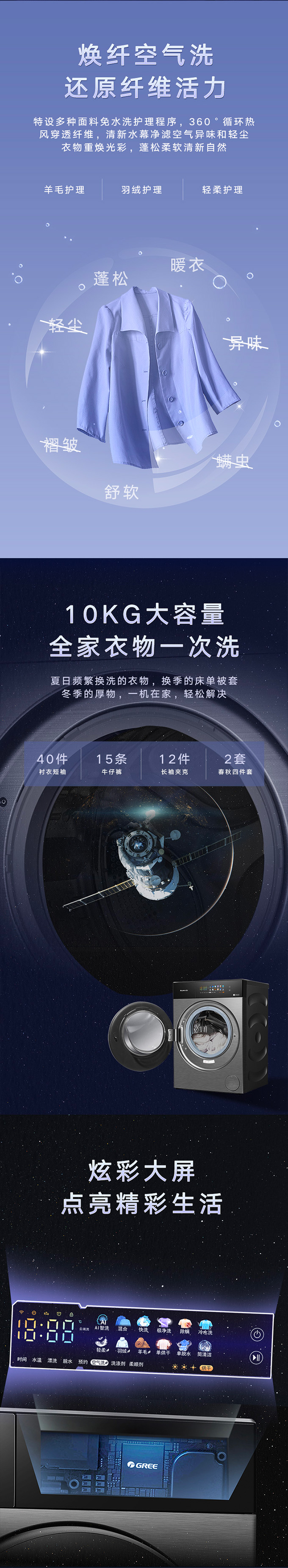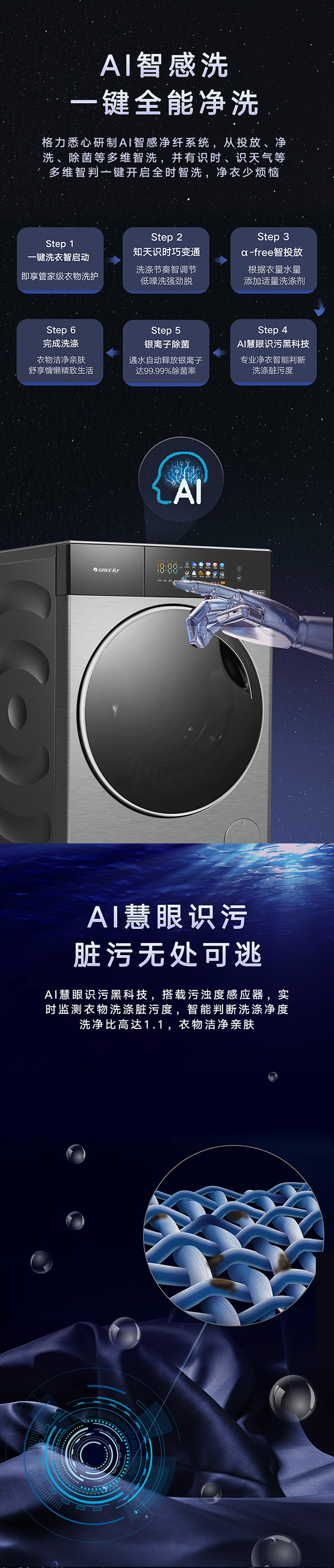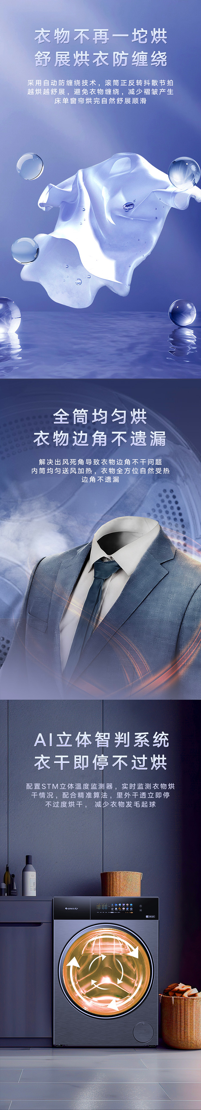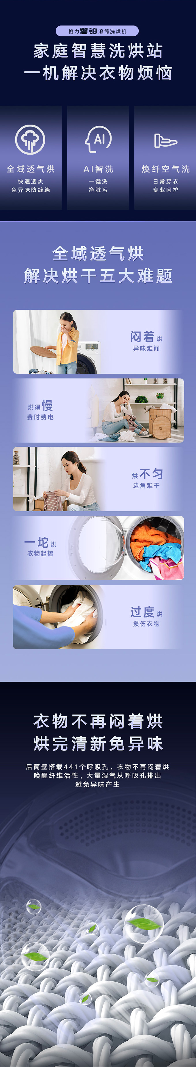 全域透氣烘,衣物不在悶著烘。AI智能感應,臟污一鍵洗凈。
