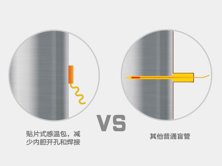 采用貼片式感溫包貼在水箱內(nèi)膽上,可減少內(nèi)膽體開(kāi)孔和焊接,杜絕感溫盲管泄漏的隱患,水箱更可靠耐用